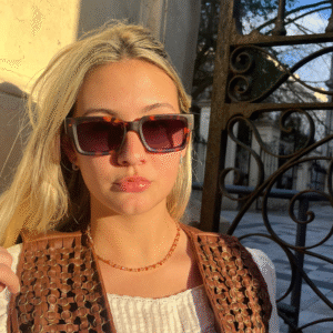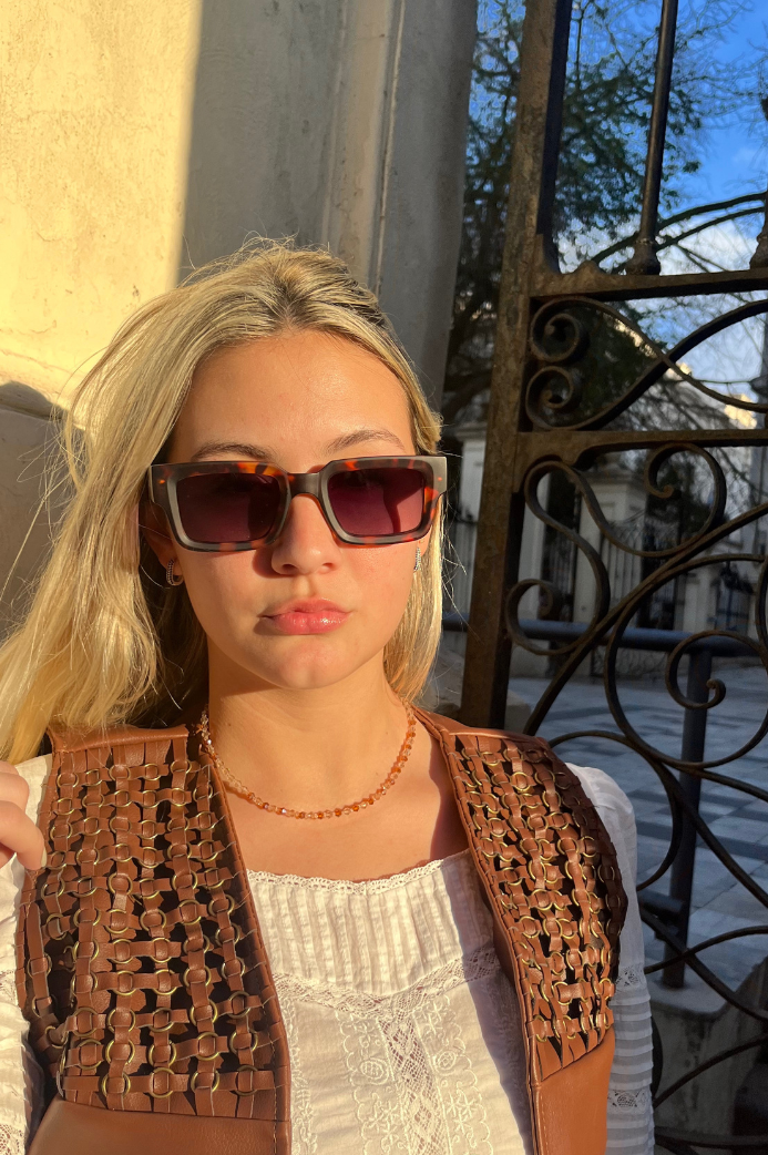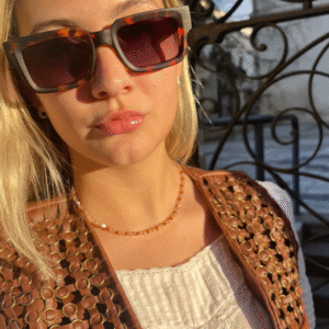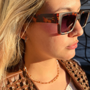 La montura de acetato premium en carey combina tonalidades ámbar y marrón, logrando un equilibrio entre lo clásico y lo atrevido. Su diseño robusto y bien definido potencia la mirada, mientras que sus lentes de policarbonato oscuros garantizan protección y estilo. Perfecto para quienes buscan un look vintage con un toque de modernidad.